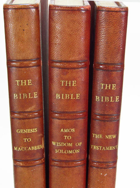 Handsomely rebound by Riviere and So. First edition of Bates' version of the King James Bible, arranged to be read in a more narrative, literary fashion. With 2 double page colour maps to rear, showing Syria and Palestine and the Mediterranean Basin. With an introduction by Lawrence Binyon Divided into three more manageable volumes. Quarter leather with raised bands. All edges gilt. 8vo. [xxxi] 1237pp. Rubbing to edges, a few marks and nicks to leather. Very light foxing to end-papers, toning to page edges. Else clean and tight. Good.