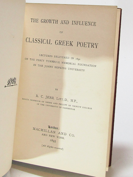 'Lectures delivered in 1892 on the Percy Turnbull Memorial Foundation in The Johns Hopkins University.' With lectures on Homer and Epic Poetry, Pindar, Greek Drama etc. Full leather prize binding with King Edward VI, Stratford crest to cover and prize plate to front pastedown. Raised bands and gilt decoration to spine, Inner and outer dentelles, marbled paper edges with matching end-papers. Rubbing and toning to spine. Contents clean and sound. Good. '